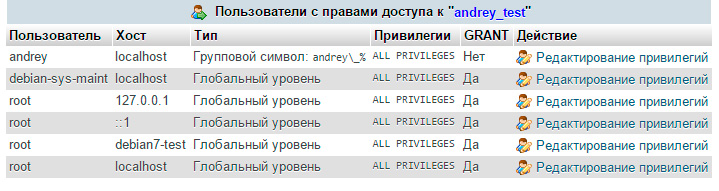 Создав базу, проверим ее привилегии, нажав одноименную ссылку рядом с именем базы.
