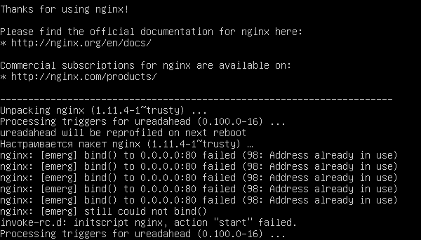 В процессе установки получим вполне закономерную ошибку: Nginx не сможет запуститься, так как 80-й порт продолжает занимать работающий Apache.