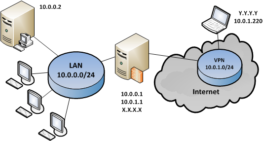 У нас имеется локальная сеть 10.0.0.0/24 с сервером терминалов 10.0.0.2 и роутером 10.0.0.1, который будет выполнять функции VPN сервера, для VPN мы зарезервировали сеть 10.0.1.0/24. Внешний интерфейс сервера имеет условный выделенный IP адрес X.X.X.X. Наша цель - предоставить удаленным клиентам доступ к терминальному серверу и общим ресурсам на нем.