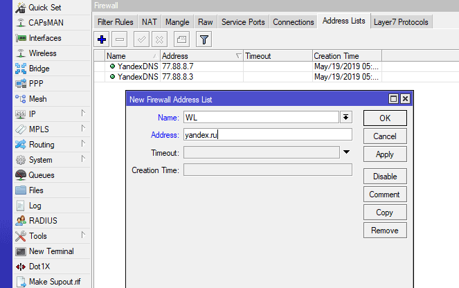 Теперь первый пришедший с данного устройства пакет добавит его IP-адрес в указанный нами список, тем самым связав его с текущим MAC на время указанное в Timeout. Для каждого следующего устройства необходимо создать подобное правило, также не забывайте снабжать каждое из них комментарием, чтобы впоследствии вам и вашим коллегам было понятно о каком именно устройстве идет речь.