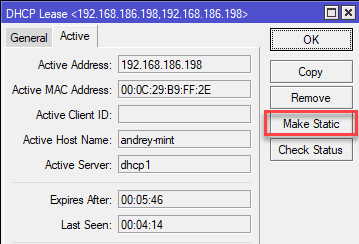 Но на практике адреса раздаются сервером DHCP, это не проблема, создаем резервирование IP-адреса, для чего следует перейти в IP - DHCP-Server - Leases и открыв запись нужного адреса нажать Make Static.
