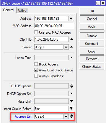 2add address=192.168.186.199 address-lists=USER mac-address=00:0C:29:B4:D0:05 server=dhcp1