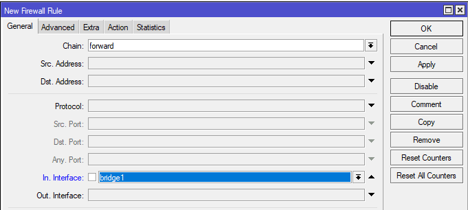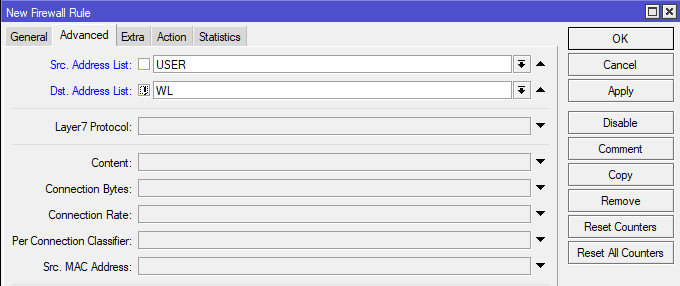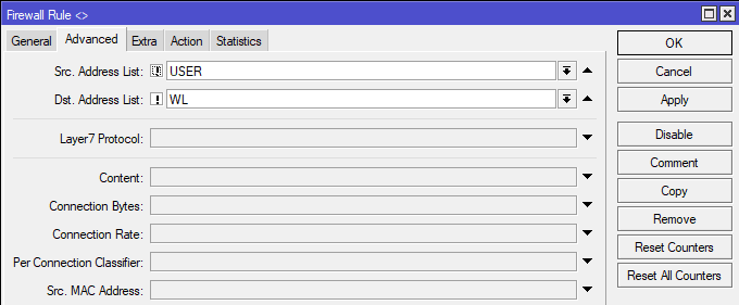 Снова перейдем в IP - Firewall - Filter Rules и создадим новое правило. На закладке General также укажем Chain - forward и In. Interface - bridge1, на Advanced указываем Src. Address List - !USER и Dst. Address List - !WL: