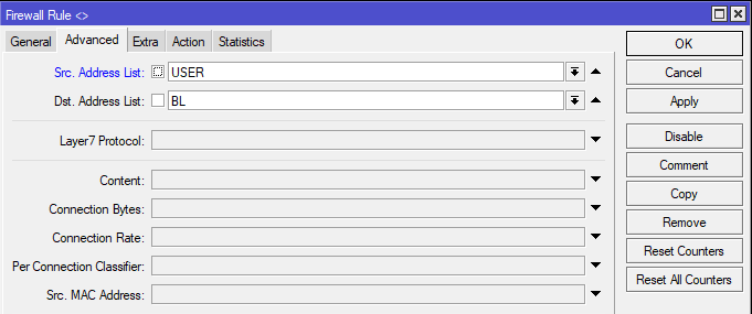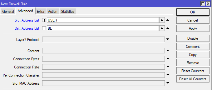 Теперь немного изменим задачу, применим черный список только к группе USER. Для этого немного изменим условия на закладке Advanced, а именно укажем Src. Address List - USER без восклицательного знака, в итоге условие будет читаться как: если источник в группе USER и назначение в группе BL.
