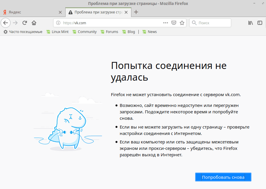После замены действия при повторной попытке посетить ресурс мы сразу увидим сообщение о его недоступности: