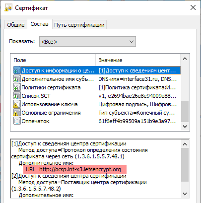 Для того, чтобы браузер смог проверить сертификат нам нужно разрешить доступ к сведениям центра сертификации, адреса нужных узлов можно найти в самом сертификате сайта: