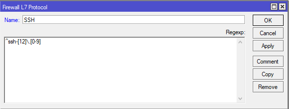 Для решения нашей задачи сначала перейдем в IP - Firewall - Layer 7 protocol и создадим новый фильтр: в поле Name напишем произвольное имя, в нашем случае SSH, а в поле Regexp внесем регулярное выражение паттерна: