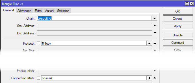 Поэтому мы пойдем другим путем и на основании L7 фильтра будем маркировать соединения, которых гораздо меньше, чем пакетов. Перейдем в IP - Firewall - Mangle и создадим новое правило: на закладке General выставляем Chain - prerouting, Protocol - tcp и Сonnection Mark - no mark:
