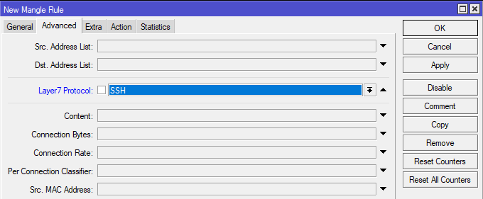 2add action=mark-connection chain=prerouting connection-mark=no-mark layer7-protocol=SSH new-connection-mark=SSH-CONN passthrough=yes protocol=tcp