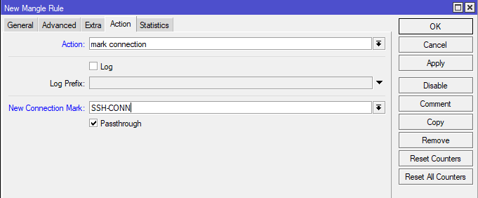 В Action указываем действие mark-connection, задаем марку соединения New Connection Mark - SSH-CONN и обязательно ставим флаг Passthrough для прохождения пакета далее по цепочке: