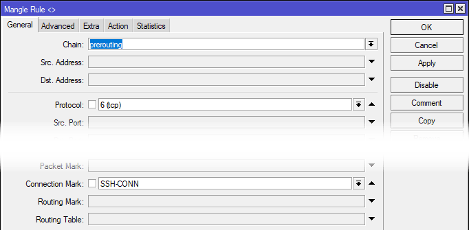 Затем добавим еще одно правило: General - Chain - prerouting, Protocol - tcp иConnection Mark - SSH-CONN: