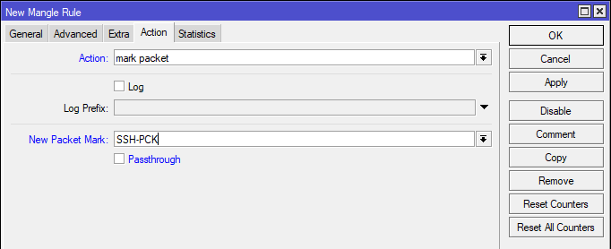 А в действиях добавим mark packet, New Packet Mark - SSH-PCK и снимем флаг Passthrough: