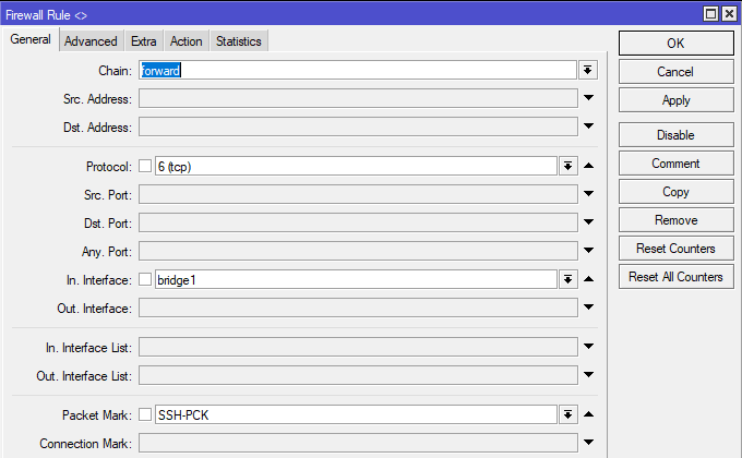 Таким образом мы пометили все пакеты, относящиеся к SSH-соединениям, но L7 фильтр мы используем только для соединений, не нагружая роутер проверкой каждого пакета. Теперь запретим транзит таких пакетов, для этого вернемся в IP - Firewall - Filter Rules и создадим правило, на закладке General которого укажем: Chain - forward, Рrotocol - tcp, In Interface - bridge1 и Packet Mark - SSH-PCK: