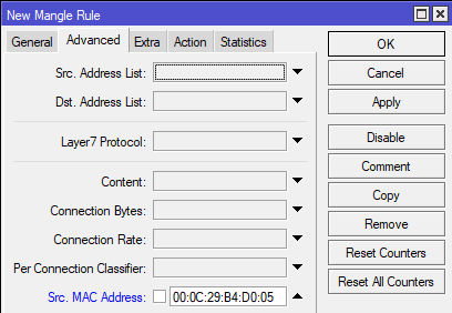 Откроем IP - Firewall - Mangle и добавим правило, на закладке General укажем Chain - prerouting, In Interface - bridge1, наAdvanced в поле Src. MAC Address укажем MAC-адрес нужного устройства.