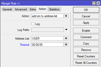И на закладке Action добавим действие add src to address list, где в поле Address List укажем требуемый список пользователей, в нашем случае USER, а в поле Timeout укажите требуемое время жизни записи, это нужно для того, чтобы запись обновилась при смене обладателем MAC IP-адреса. На скриншоте мы, в тестовых целях, использовали 5 секунд, в реальной жизни руководствуйтесь здравым смыслом и выбирайте более высокие значения.