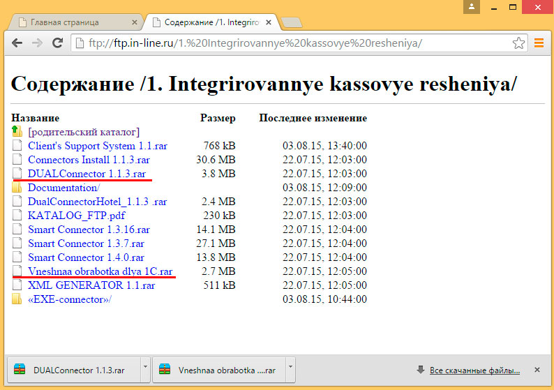 Чтобы скачать необходимые компоненты посетим сайт поддержки INPAS и перейдем в раздел Свободно распр. ПО, который ведет на FTP-сервер компании, где нас интересует директория 1. Integrirovannye kassovye resheniya. Здесь находим и скачиваем два компонента: Vneshnaa obrabotka dlya 1C.rar и DUALConnector 1.1.3.rar.