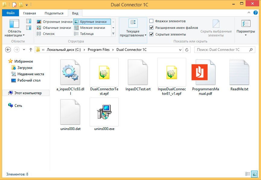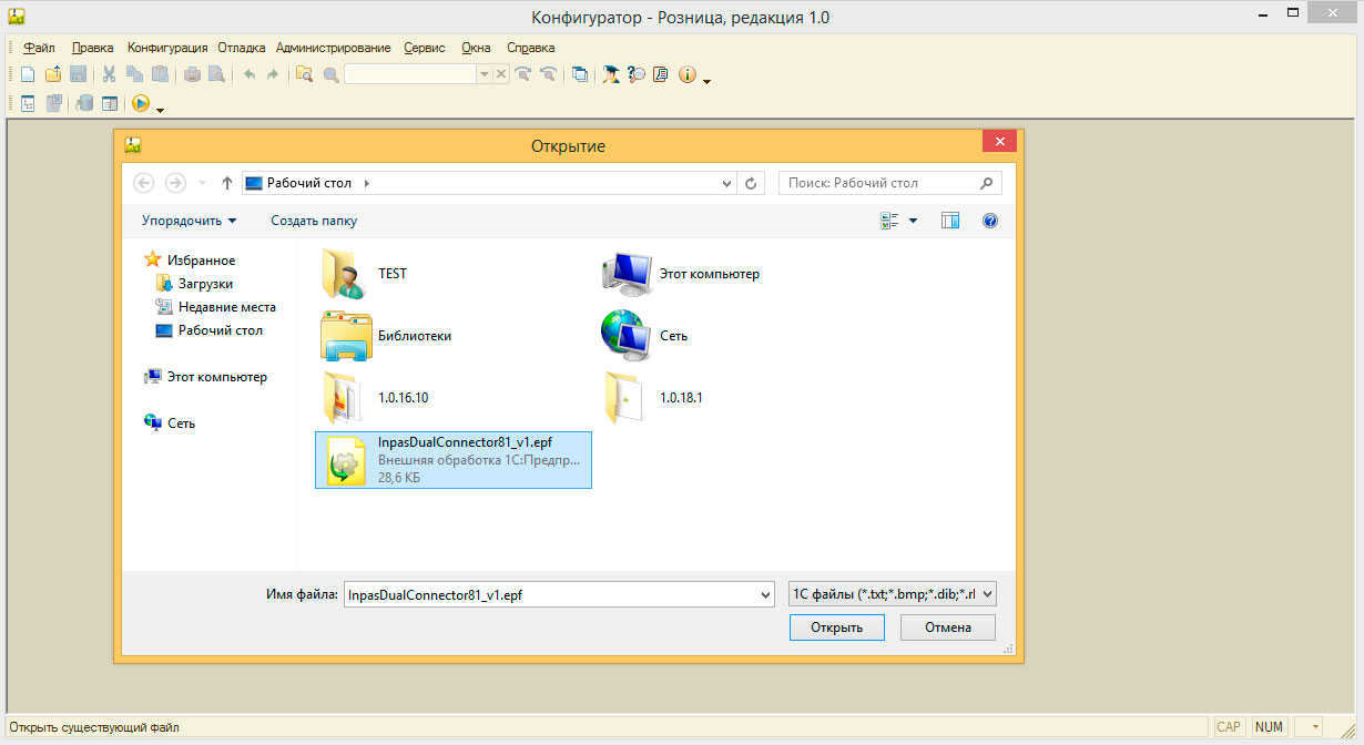 Распаковав архив с Vneshnaa obrabotka dlya 1C.rar, установим компоненту Dual Connector 1C и прейдем в папку с установленной программой.