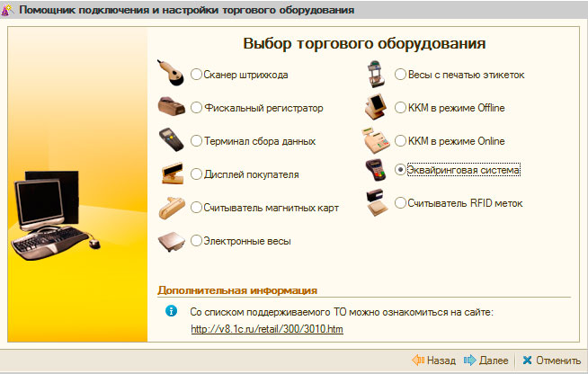 Теперь запускаем 1С:Розница и переходим к Помощнику подключения и настройки торгового оборудования, где выбираем Эквайринговую систему.