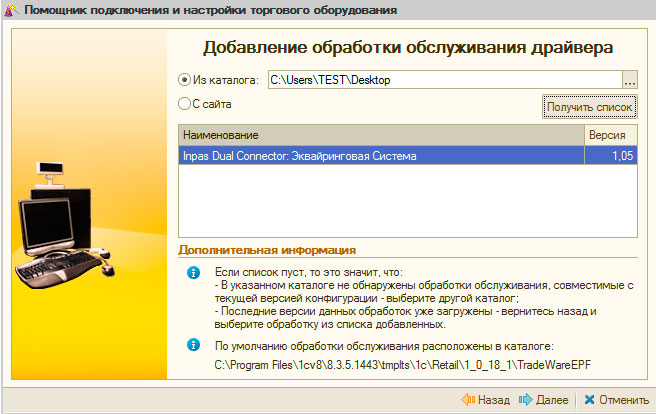 Указываем каталог, где находится сконвертированная обработка и нажимаем Получить список, ниже должна появиться Inpas Dual Connector: Эквайринговая система, выбираем ее и жмем Далее.