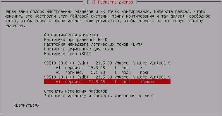 В нашем примере мы будем использовать виртуальную машину с двумя жесткими дисками, один для системы, второй для данных, точку монтирования диска для данных мы указали как /samba, вы можете использовать другое имя и расположение.