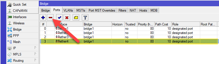Прежде всего определим порт, в который будет подключена приставка и выведем его из моста локальной сети (если он туда включен), в нашем случае это будет порт ether4. Для этого перейдем в Bridge - Ports и удалим запись для нужного порта.
