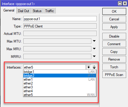 Если вы используете для подключения к интернету коммутируемое подключение, то в его свойствах вместо внешнего интерфейса (ether5 в нашем примере) следует указать интерфейс моста bridge2. В данном случае это будет PPPoE подключение провайдера Ростелеком.