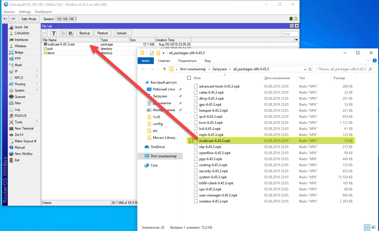 Затем откройте Winbox, перейдите в раздел Files и загрузите на устройство пакет multicast, это можно сделать простым перетаскиванием, затем перезагрузите роутер.