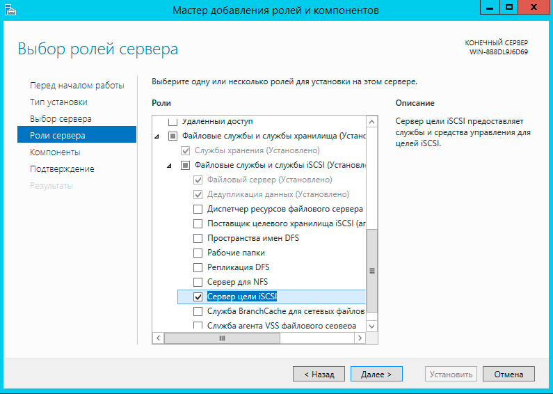 Для установки роли Cервера цели iSCSI запустите Мастер добавления ролей и компонентов, затем последовательно разверните пункты Файловые службы и службы хранилища - Файловый службы и службы iSCSI и укажите одноименную роль.