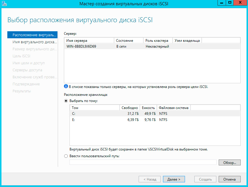 Для создания нового виртуального диска щелкните соответствующую ссылку или выберите соответствующий пункт из меню Задачи, откроется Мастер создания виртуальных дисков iSCSI, который в первую очередь попросит вас указать расположение хранилища.