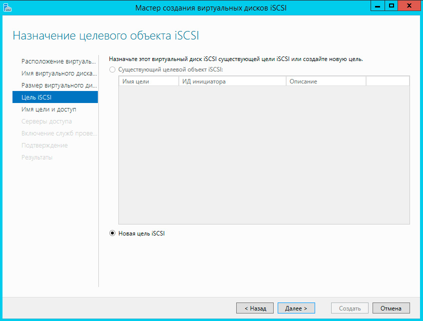 Созданный виртуальный диск можно назначить как уже существующей цели (таргету), так и создать новый, в этом случае просто укажите имя цели, IQN будет сформирован автоматически.