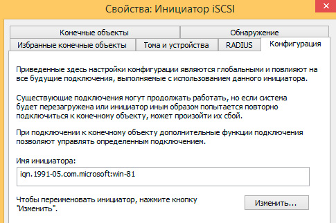 IQN ткущего инициатора можно посмотреть на закладке Конфигурация: