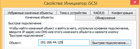 Но можно поступить проще, перейдите на закладку Конечные объекты и выполните Быстрое подключение к Cерверу цели, подключиться по понятным причинам не получится, но IQN инициализатора останется в кэше сервера.