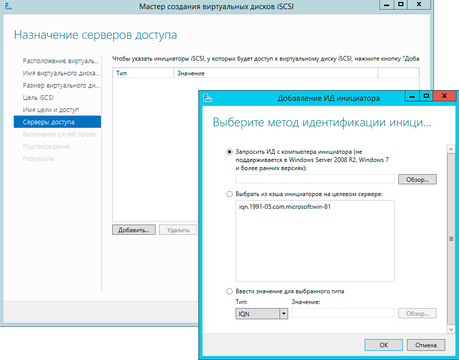 Вернемся на сервер и нажав кнопку Добавить выберем IQN инициатора из кэша, для современных систем вы также можете получить IQN инициатора выполнив подключение к нему по IP-адресу или имени хоста: