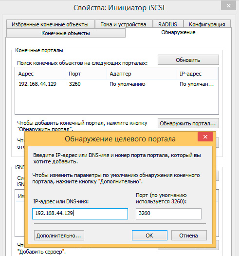 На остальных шагах оставляем значения по умолчанию, после чего работа мастера будет завершена, виртуальный диск создан и назначен соответствующей цели. Теперь следует подключить созданный диск к целевой системе. Можно воспользоваться функцией быстрого подключения, тогда все диски цели будут подключены с параметрами по умолчанию, что не всегда правильно. Поэтому перейдите на закладку Обнаружение и нажмите кнопку Обнаружить портал: