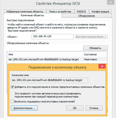 Возвращаемся на закладку Конечные объекты и выполняем ручное подключение найденных дисков, при этом, нажав на кнопку Дополнительно, можно самостоятельно настроить параметры подключения, например, выбрать сетевой адаптер, обслуживающий сеть SAN.