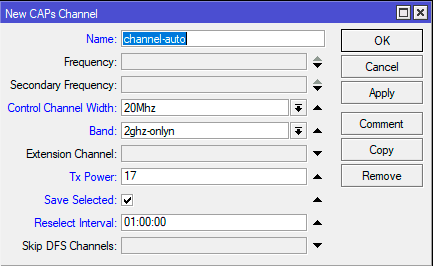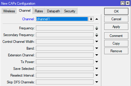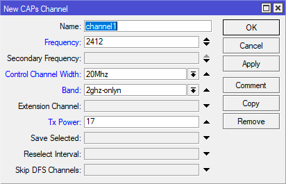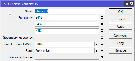 Начнем с рабочих каналов, переходим в CAPsMAN - Channels и создаем новую настройку. В самом простом варианте это будет одна рабочая частота, например, 2412 МГц или 1 канал. Обратите внимание, выпадающего списка частот тут нет, просто указываем значения руками. Затем задаем ширину канала в поле Control Channel Width, если вы указали широкий канал, то укажите и направление его расширения по частоте в поле Extension Channel, если мы говорим о первом канале, то здесь единственным значением будет Ce, либо можете указать ХХ для автоматического выбора.