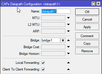 Следующий шаг - настройка шаблонов пересылки данных, для этого перейдем в CAPsMAN - DataPaths. Создадим новую настройку и обязательно укажем: Bridge - интерфейс сетевого моста, куда будет подключен беспроводной интерфейс после его активации. Обратите внимание, что выбранное значение применяется ко всем устройствам. В нашем случае bridge1 должен быть интерфейсом локальной сети для всех настраиваемых устройств.