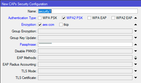 Затем переходим в CAPsMAN - Security Cfg. и создаем новую настройку безопасности, здесь все просто, запутаться решительно негде: