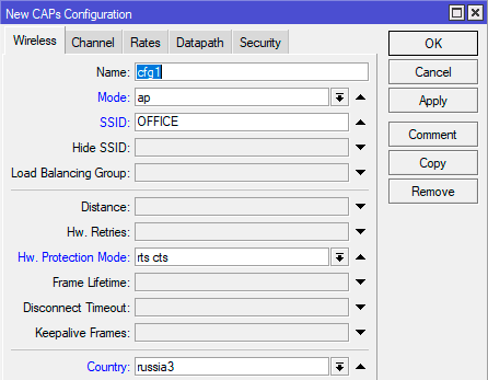 После того, как вы выполнили данные настройки самое время создать конфигурацию, это можно сделать в CAPsMAN - Configurations. На вкладке Wireless указываем режим работы - Mode -ap - точка доступа. Имя беспроводной сети - SSID,Country - страна - russia3 (для России). Это основные настройки, но также можно указать и дополнительные, скажем Hw. Protection Mode - защита от скрытого узла.