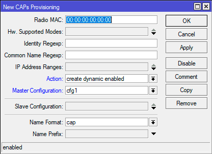 Созданную нами конфигурацию нужно распространить на точки доступа, за это отвечает настройка развертывания CAPsMAN - Provisioning. Самый простой вариант будет выглядеть так: Radio MAC - везде нули, т.е. любая точка доступа, Action - create dynamic enabled - динамическое создание беспроводного интерфейса на точке доступа, Master Configuration - применяемая при создании интерфейса конфигурация.