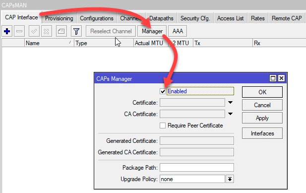 На этом базовая настройка контроллера завершена, осталось только его включить, для этого в CAPsMAN - CAP Interface нажмите кнопку Manager и в открывшемся окне установите флаг Enabled.