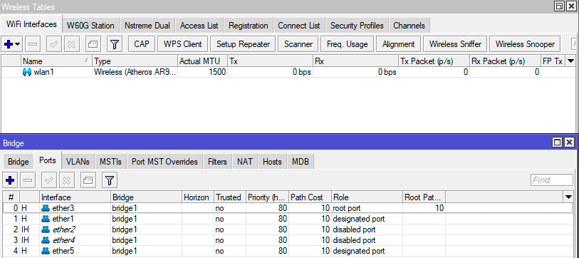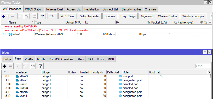 Теперь перейдем к настройке точек доступа. Прежде всего убедимся, что беспроводной интерфейс не входит ни в один мост, а мост, смотрящий в локальную сеть, имеет имя bridge1, которое мы указали в настройках Datapath контроллера.