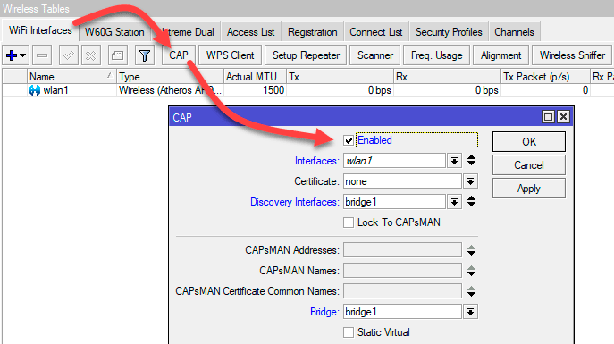 В Wireless - WiFi Interfaces нажимаем кнопку CAP и в открывшемся окне устанавливаем флаг Enabled, а также указываем: Interfaces - беспроводные интерфейсы, которые управляются CAPsMAN, если их несколько - добавляем все, Discovery Interfaces - сетевой интерфейс, через который осуществляется связь с контроллером, в нашем случае это тот же мост bridge1, но в более сложных сетях точка может работать в одной сети, а управляться через другую, поэтому стоит разделять эти понятия. Bridge - сетевой мост, куда будет подключен беспроводной интерфейс после активации.