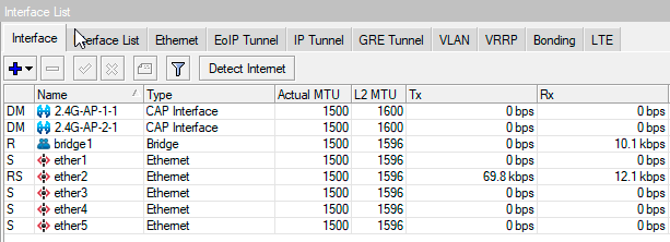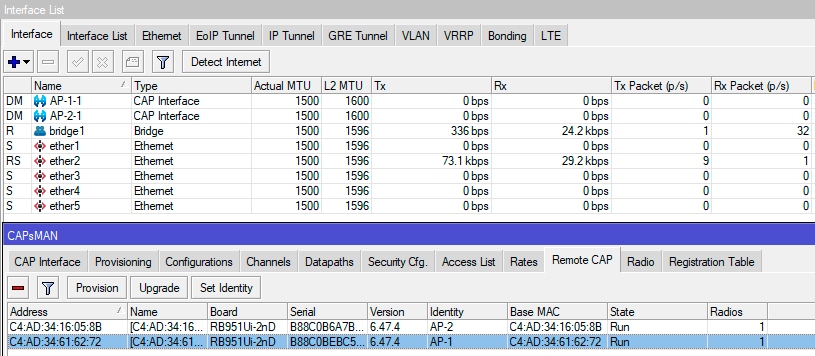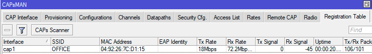 Вернемся на контроллер, управляемые точки доступа можно увидеть в CAPsMAN - CAP Interface, а подключенных клиентов в CAPsMAN - Registration Table, при этом будет указана точка доступа, к которой подключен клиент.
