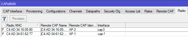 Хорошо, когда все точки одинаковые и к ним можно применить одинаковые настройки, но что делать, если это не так и разные точки должны получать разные конфигурации? Нет проблем, прежде всего создадим необходимые конфигурации, а затем выясним MAC-адреса беспроводных интерфейсов точек, это можно сделать на вкладке CAPsMAN - Radio. Обратите внимание, что нам нужен именно Radio MAC.