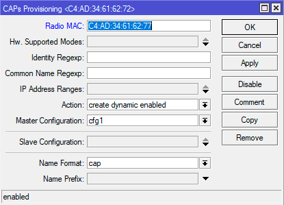 Теперь возвращаемся на вкладку CAPsMAN - Provisioning и создаем настройки развертывания для каждой точки, указав ее Radio MAC, при этом настройку с нулевым MAC-адресом следует выключить, в противном случае к устройству применится именно она, а не персональные настройки.