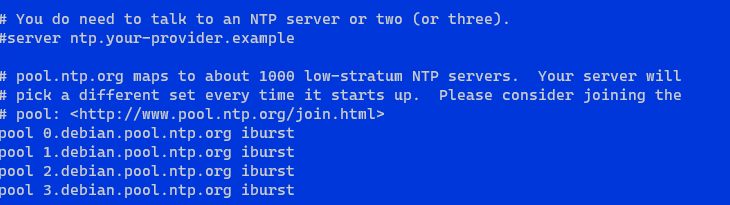Начнем с вышестоящих серверов для синхронизации времени, рекомендуется выбирать ближайшие к вам сервера, их адреса можно получить на сайте ntppool.org. Затем найдем в конфигурационном файле следующую секцию: