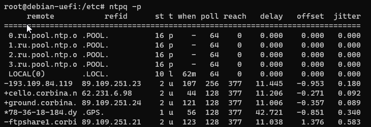 В колонке st указывается stratum - приоритет сервера, аdelay содержит задержку ответа от сервера. Как видим, в нашем случае служба времени выбрала для синхронизации сервер с приоритетом 1, который синхронизируется от GPS-часов, несмотря на более высокий уровень задержки при работе с ним.