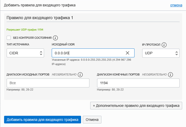 Укажите: Тип источника - CIDR, Исходный CIDR - 0.0.0.0/0, IP-протокол - UDP, Диапазон исходных портов - Все, Диапазон конечных портов - 1194.