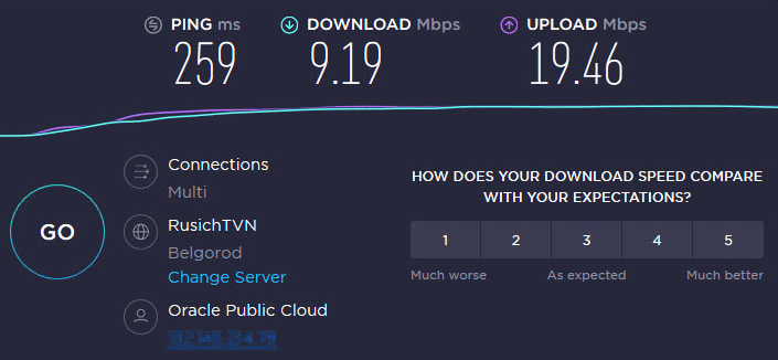 Сразу обращаем внимание на выросший пинг - это последствия размещения сервера в Штатах, а также скорость скачивания не выше 10 Мбит/с - ограничение бесплатного тарифа Oracle, хотя в большинстве случаев этого вполне достаточно для комфортного серфинга.